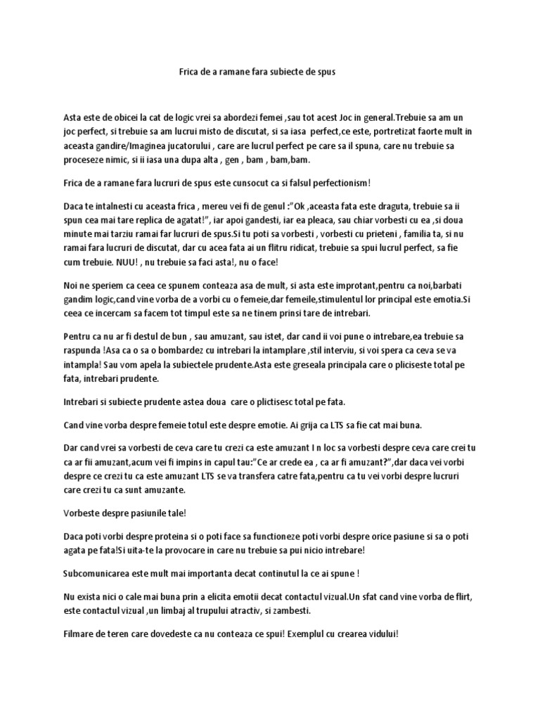 Femeile nu se prea lasa la asemenea discutii, chiar daca insisti si te stradui sa o faci sa se simta cat mai comfortabil. Oricat de multa grija ai avea la o intalnire, momentele stanjenitoare sunt aprope exista o serie de subiecte de discutie pe care nu trebuie sa le abordezi cand te intalnesti cu un baiat pentru prima oara. Nu poti veni cu un manual de discutii si sa incepi.
